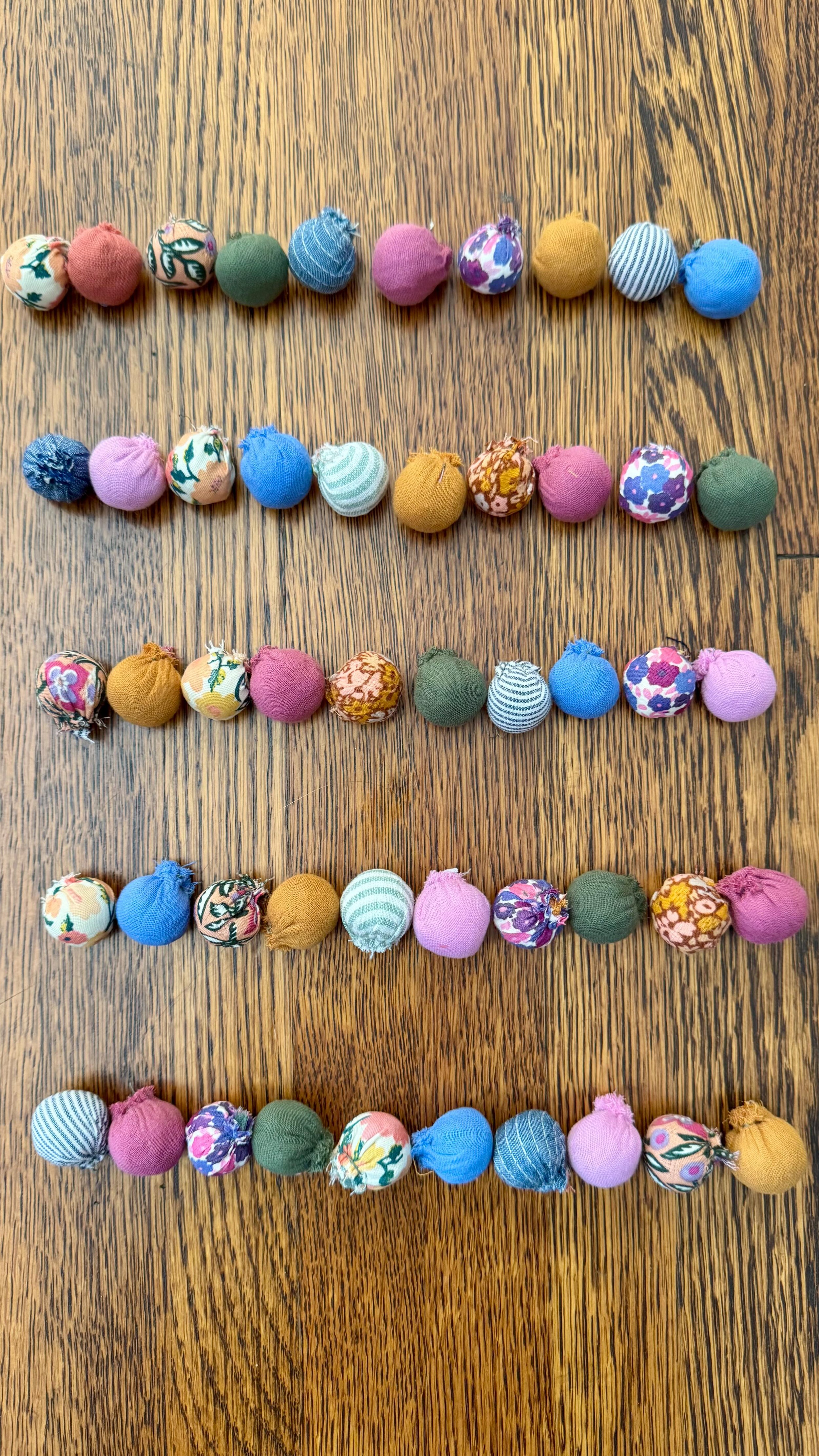 Bring a touch of the forest indoors with a charming fabric acorn garland. Each acorn is crafted from real acorn caps and paired with upcycled fabric, carefully stitched and filled with soft fabric scraps. Strung on thin gold twine, this garland adds a dainty bit of whimsy.